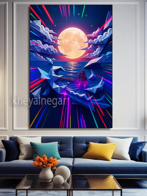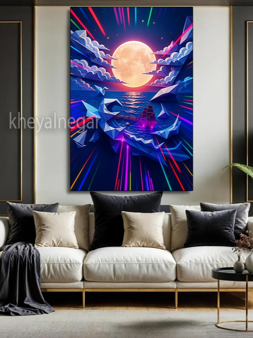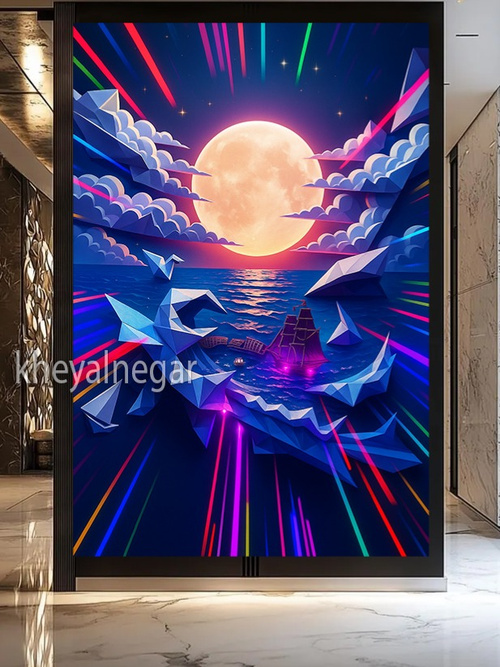 این اثر هنری زیبا، صحنهای کلاژ مانند از دریا، ماه کامل و نورهای رنگین را به تصویر میکشد. این ترکیب شگفتانگیز از عناصر طبیعت و هنر مدرن، شما را به دنیایی از خیال و رنگ دعوت میکند.