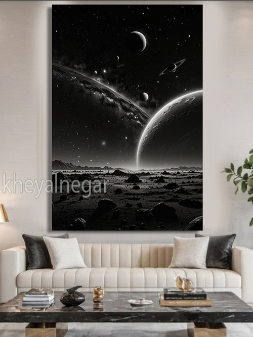 این اثر هنری، نمایی خیرهکننده از سیارات و منظومههای مختلف در کهکشان را به نمایش میگذارد. تضادهای واضح سیاه و سفید به زیبایی جزئیات و عمق فضا را نشان میدهند و حس شگفتی و کشش کیهانی را به تصویر میکشند. ✨