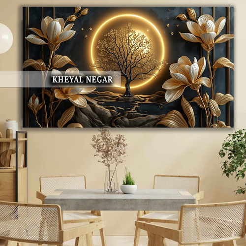 این تابلوی زیبا شما را به دنیایی از آرامش و زیبایی طبیعی دعوت میکند. با تصویر درختی جادویی و گلهای برجسته در کنار یک دایره درخشان، این اثر هنری جلوهای از صلح و هماهنگی را به فضاهای زندگی شما میآورد.