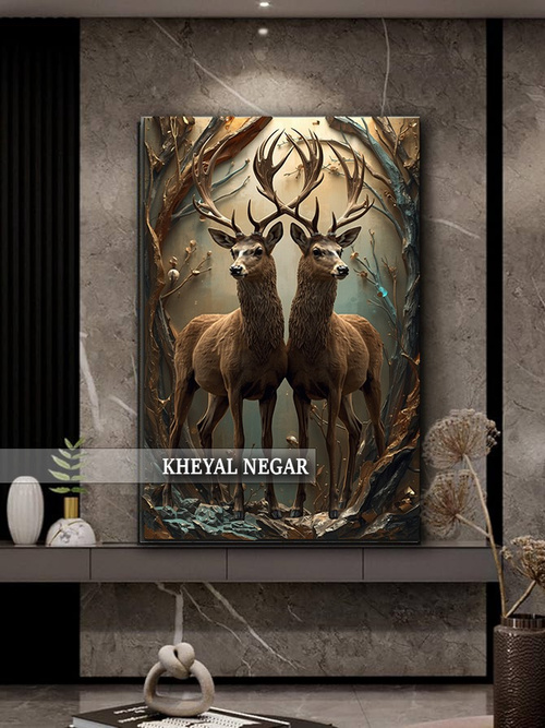 این اثر هنری، نمایشی زیبا از دو گوزن نر قدرتمند است که در دل طبیعت و میان شاخههای هنری محصور شدهاند. طراحی متقارن و جزئیات فوقالعاده، جلوهای خاص به این تابلو میبخشد و حس قوی طبیعت را به فضا منتقل میکند. 🦌🌲