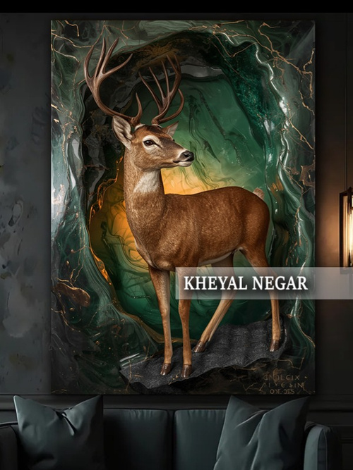این اثر هنری شگفتانگیز نمایانگر گوزن نر با شاخهایی زیبا است که در فضایی جادویی و درخشان ایستاده است. ترکیب رنگهای تیره و نورهای ملایم حس رازآلودی را به تصویر میدهد. 🦌✨