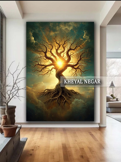 این اثر هنری بینظیر، نمایانگر درختی با ریشههای عمیق و شاخههای بلند است که در مقابل نور درخشان خورشید قرار دارد. ترکیب رنگهای گرم و روشن، حس زندگی و طبیعت را به فضا میآورد. 🌳✨