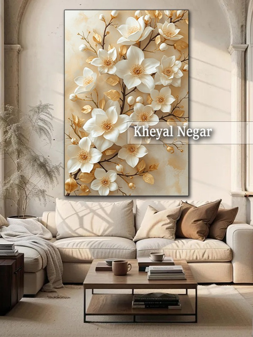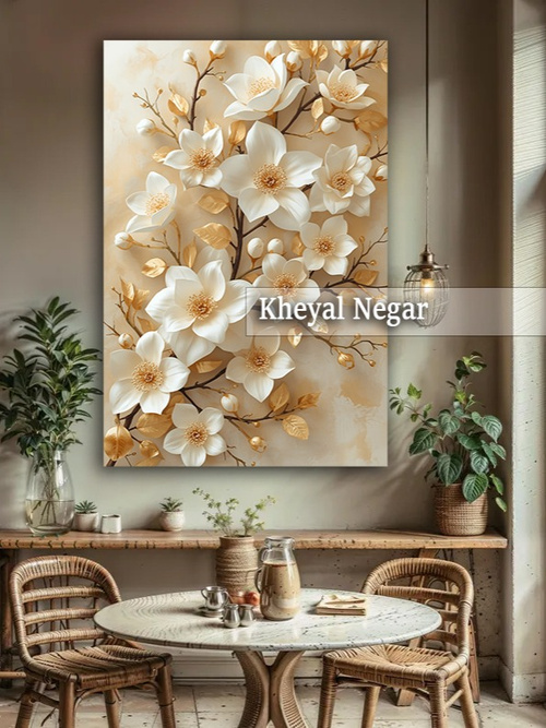 این اثر هنری زیبا، نمایانگر گلهای مگنولیا با رنگهای ملایم و طراحی شیک است. ترکیب رنگهای سفید و طلایی جذابیت و لطافت خاصی را به فضا میبخشد و حس زندگی و طراوت را به تصویر میکشد. 🌼✨