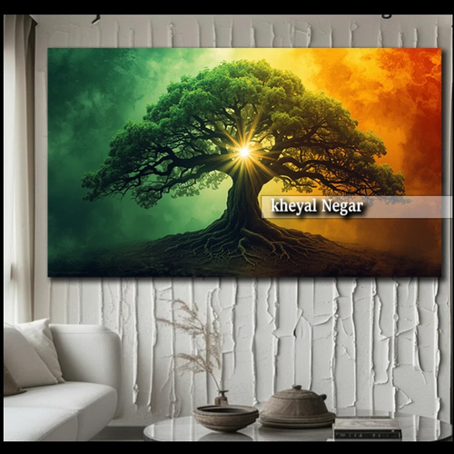 این اثر هنری شگفتانگیز، نمایانگر درختی بزرگ و زیبا است که نور خورشید از میان شاخههای آن ساطع میشود. زمینه رنگارنگ و جذاب این تابلو، حس زندگی و انرژی را به فضا منتقل کرده و نمایی مملو از آرامش و طبیعت را به تصویر میکشد. 🌳☀️